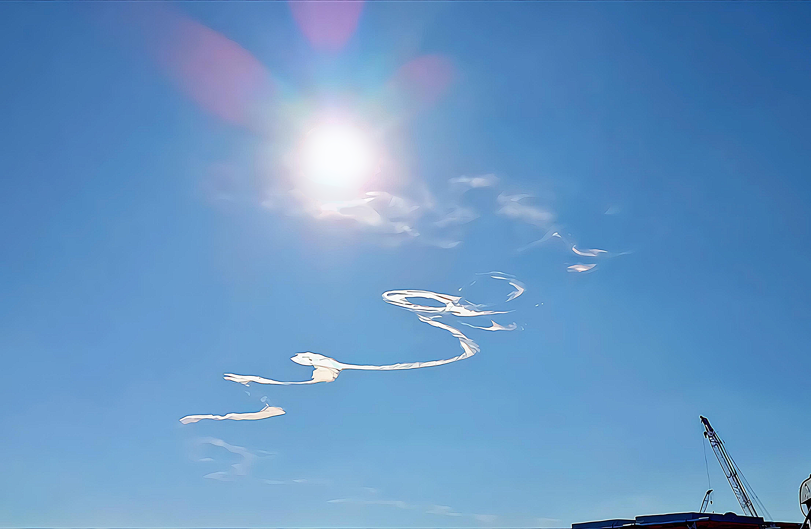 仕事に戻り照射中ふと空を見上げると、打ち上げたロケットの雲が風に流されてWの形に。